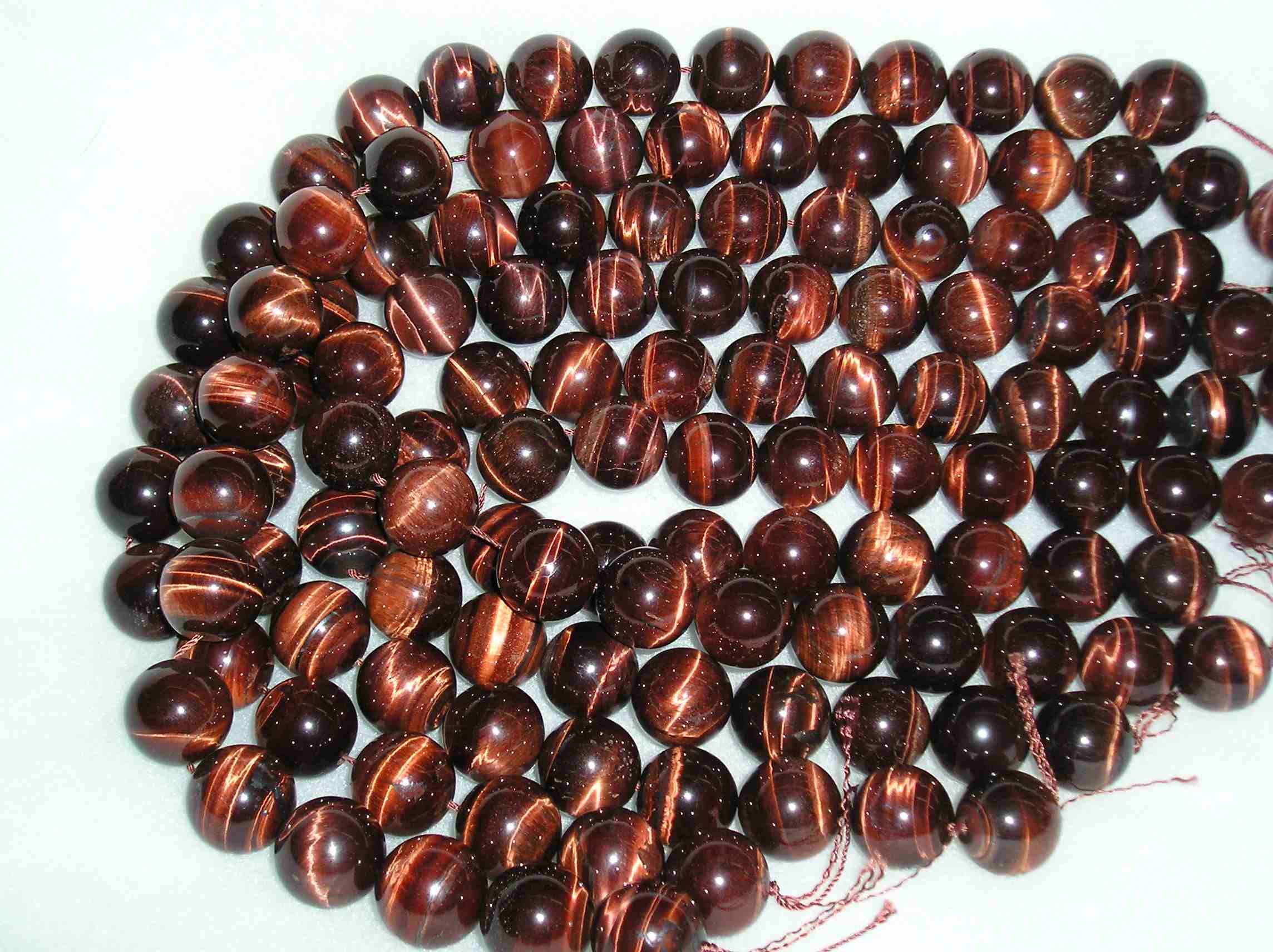 Finely fibrous, opaque aggregate formed when quartz replaces the mineral crocidolite. With natural Tigereye, the iron in the crocidolite has oxided to a brown color, keeping the fibrous structure. Natural Tigereye is heat treated to produce Red Tigereye. Deposits are found in South Africa, Australia, Burma, India, Namibia, and the United States.
